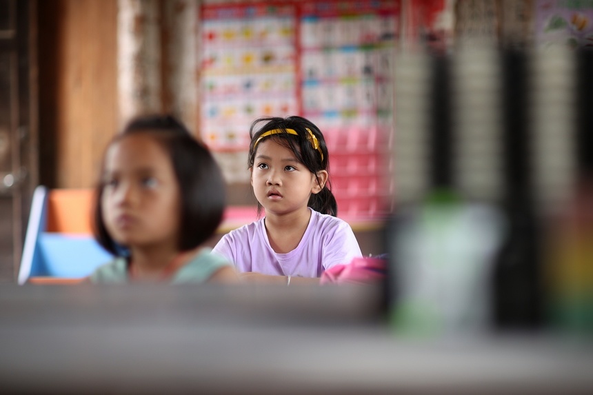 Mo Haifei (back) and Ou Xiuhui learn their first lesson at the teaching center in Danggan village, Paidiao town, Danzhai county in southwest China's Guizhou Province on Sept. 1, 2021. (Photo/People's Daily Online)