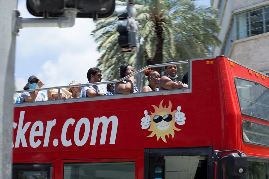 Tourists ride on a double decker bus on Lincoln Road in Miami-Dade County, Florida, the United States, Aug. 6, 2021. (Photo by Monica McGivern/Xinhua)