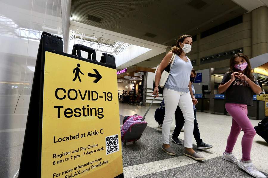 Travelers with face masks are seen at the Los Angeles International Airport in Los Angeles, the United States, July 18, 2021. (Xinhua)