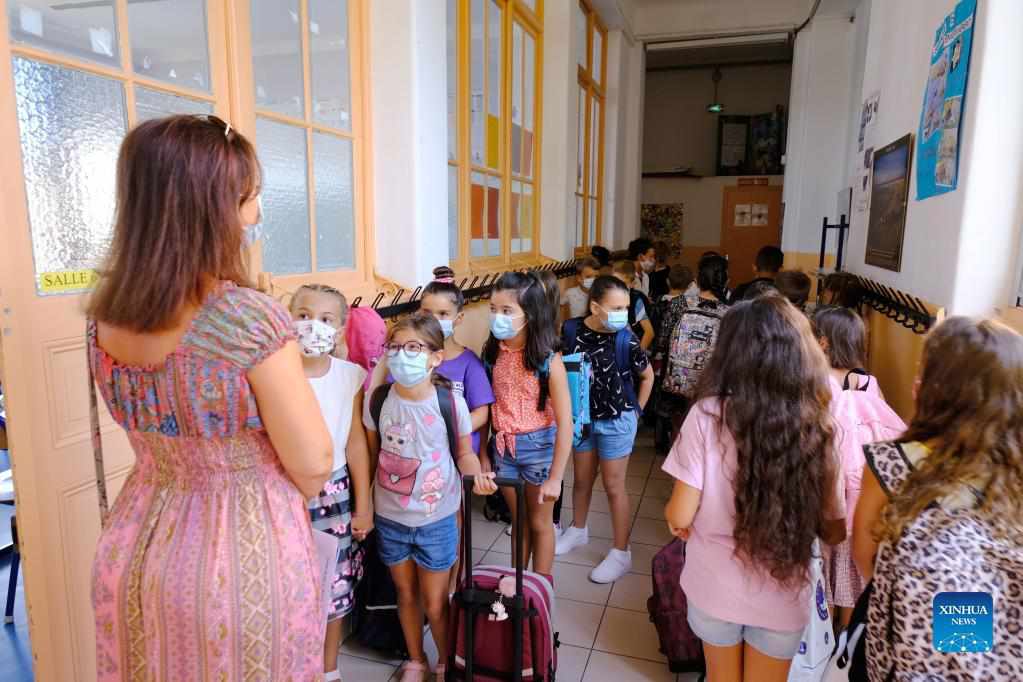 Students arrive at Fontonne school on the first day of the new school year in Antibes, southern France, on Sept. 2, 2021. (Photo by Serge Haouzi/Xinhua)