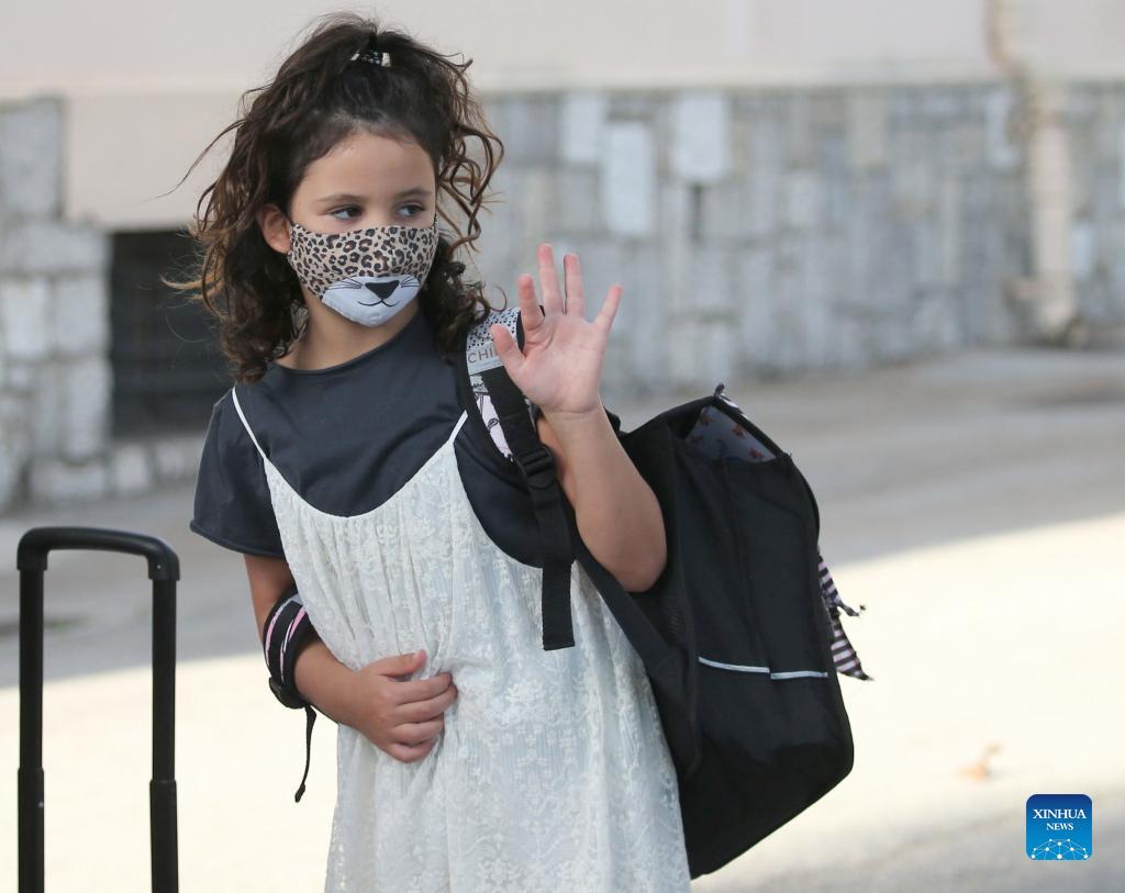 A student arrives at Fontonne school on the first day of the new school year in Antibes, southern France, on Sept. 2, 2021. (Photo by Serge Haouzi/Xinhua)