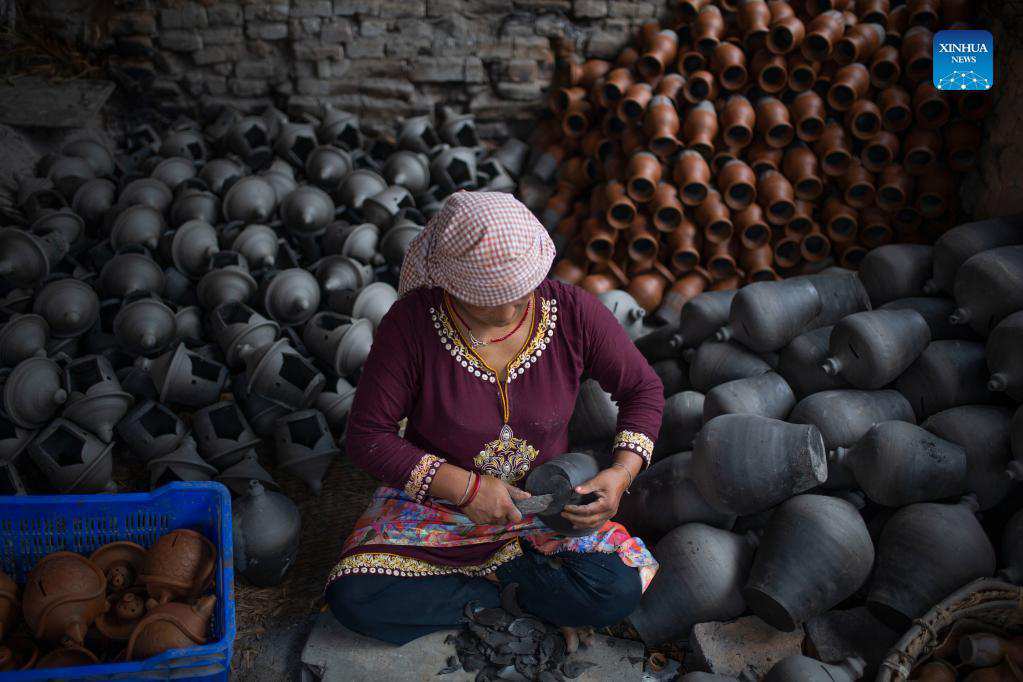 A craftswoman works on a pottery at a pottery square in Bhaktapur, Nepal, on Sept. 1, 2021. Bhaktapur is known for its centuries-old pottery craft, which has been passed down through generations. The pottery produced in Bhaktapur is regarded superior to those made elsewhere, owing to the usage of black clay which can be found only in one place and can only be dug once a year by Bhaktapur natives. (Xinhua/Sulav Shrestha)