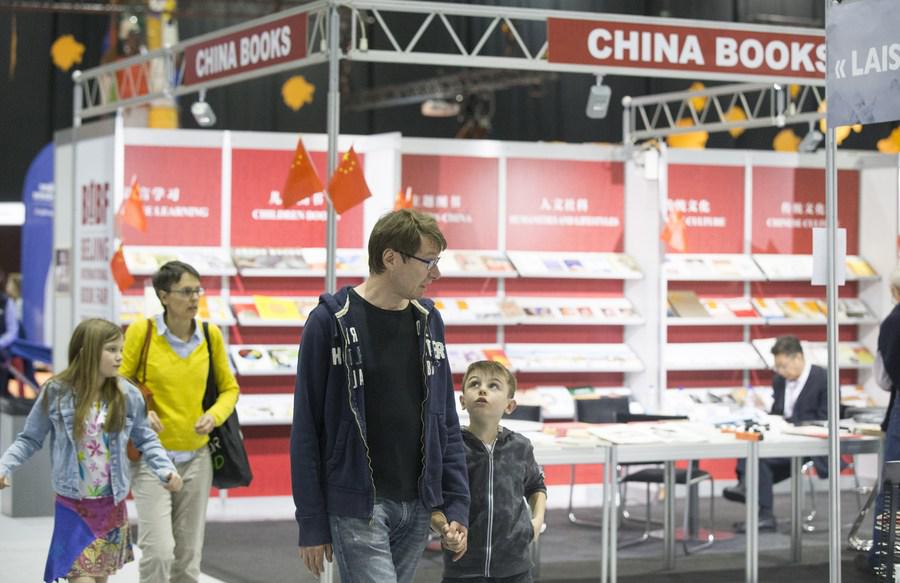 Visitors pass by the booth of China at the Geneva Book Fair in Geneva, Switzerland, on May 1, 2019. (Xinhua/Xu Jinquan)