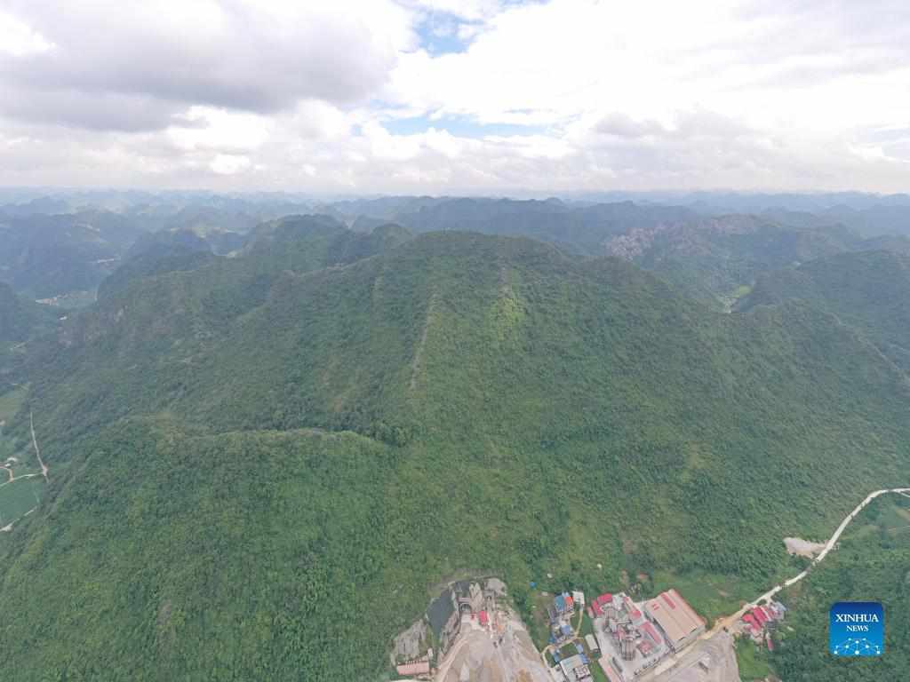 Aerial photo taken on Sept. 2, 2021 shows a railway tunnel under construction in Du'an Yao Autonomous County, south China's Guangxi Zhuang Autonomous Region. A 15.2-km tunnel on the high-speed railway linking Nanning of south China's Guangxi Zhuang Autonomous Region and Guiyang of southwest China's Guizhou Province was drilled through on Thursday. (Xinhua/Zhou Hua)