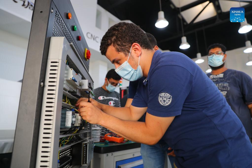 A trainee learns circuit connection at Computer Numerical Control (CNC) Installation and Commissioning Training Area of Luban Workshop at Ain Shams University in Cairo, Egypt, Aug. 16, 2021. (Xinhua/Sui Xiankai)