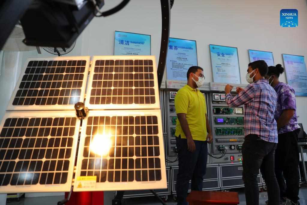 Trainees learn simulated wind-photovoltaic hybrid generating system at New Energy Technology Training Area of Luban Workshop at Ain Shams University in Cairo, Egypt, Aug. 16, 2021. (Xinhua/Sui Xiankai)