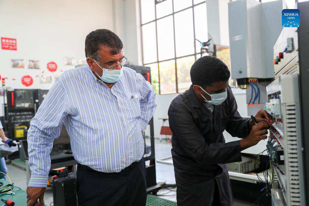 Mohamed Ahmed Awad, executive director of Luban Workshop at Egypt's Ain Shams University, checks trainee Ibrahim Abdel Ghaffar's operation of circuit connection at Computer Numerical Control (CNC) Installation and Commissioning Training Area of Luban Workshop at the university in Cairo, Egypt, Aug. 16, 2021. (Xinhua/Sui Xiankai)