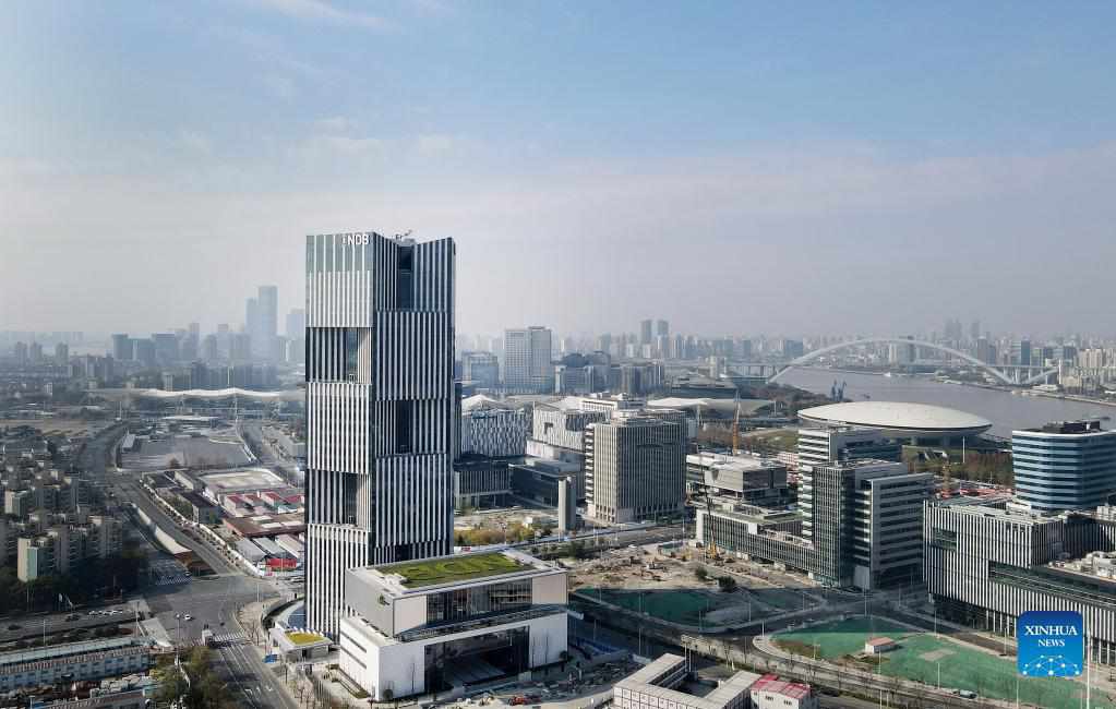 Aerial photo taken on Dec. 17, 2020 shows the headquarters building of BRICS New Development Bank (NDB) in east China's Shanghai. BRICS New Development Bank (NDB) announced Thursday that it will add the United Arab Emirates (UAE), Uruguay and Bangladesh as its newest members. (Xinhua/Fang Zhe)