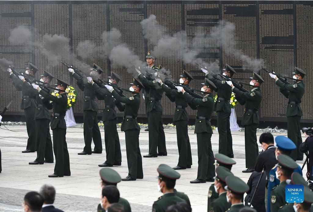 Soldiers fire a gun salute during a burial ceremony for the remains of 109 Chinese People's Volunteers (CPV) martyrs at the CPV martyrs' cemetery in Shenyang, northeast China's Liaoning Province, Sept. 3, 2021. The remains of 109 Chinese soldiers killed in the 1950-53 Korean War were laid to rest on Friday in Shenyang. (Xinhua/Yang Qing)
