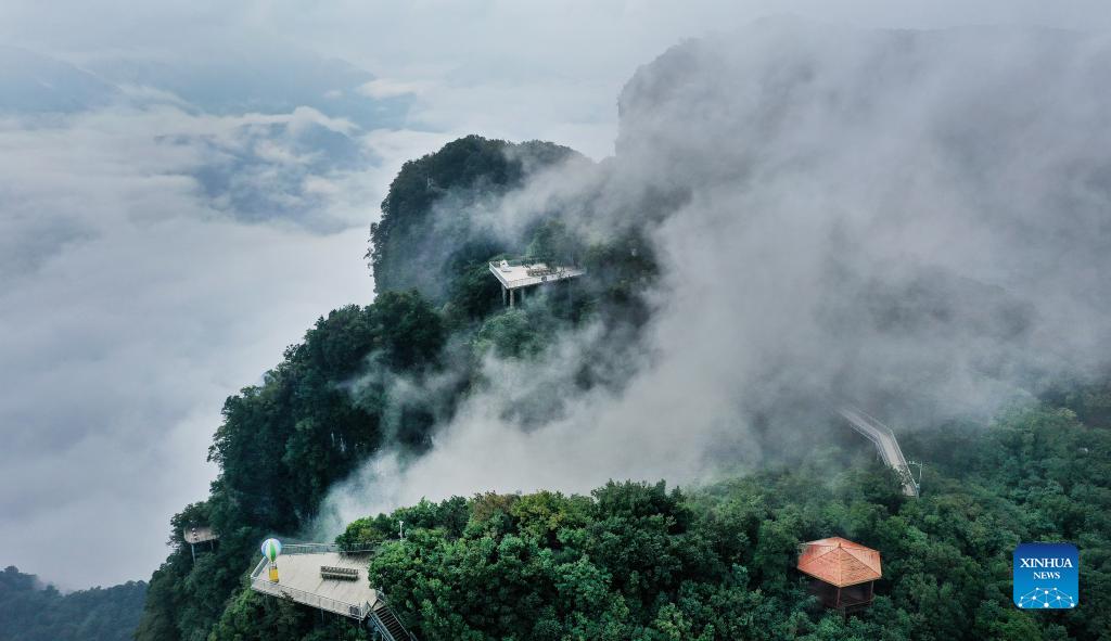 Aerial photo taken on Sept. 2, 2021 shows the scenery of Longtoushan scenic area shrouded in clouds in Nanzheng District of Hanzhong, northwest China's Shaanxi Province. (Xinhua/Tao Ming)