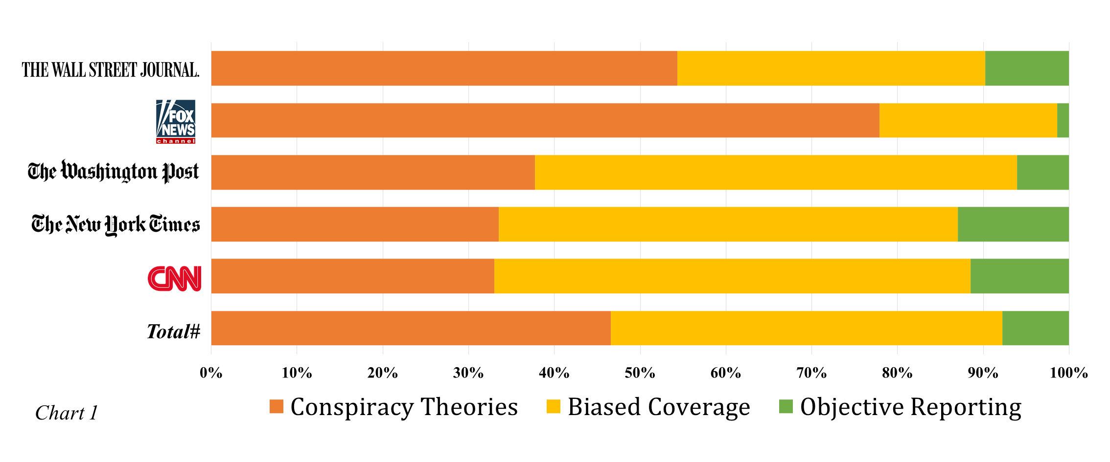 The People’s Daily Online examined 966 pieces of news articles and videos clips regarding China and COVID-19 from five American mainstream news outlets – namely, Wall Street Journal, Fox News, Washington Post, New York Times, and CNN – spanning from March 2020 to August 2021 and has found that, overall, nearly five-to-ten pieces (46.6%) have clung onto conspiracy theories, while 45.7% are inherently or explicitly biased, and less than one-in-ten pieces (7.7%) can be considered as objective reporting. (See Chart 1)