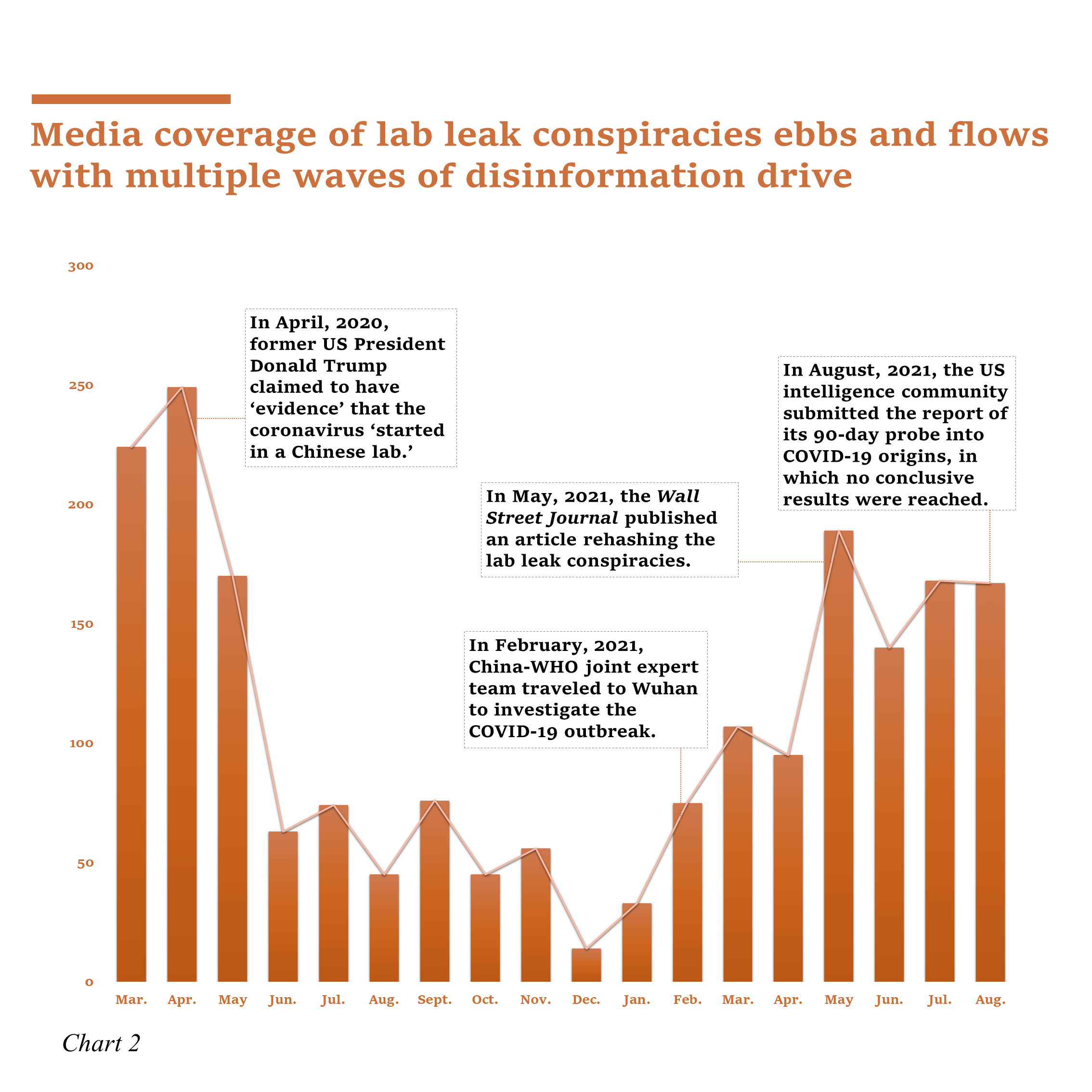 The frequency of media coverage on lab leak conspiracies, dating from March 2020 to August 2021, tends to fluctuate alongside major events involving those conspiracies, People’s Daily Online has found. After analyzing coverage of lab leak conspiracies by multiple media outlets – mainly American ones, excluding Chinese media outlets – it was found that news articles on lab leak conspiracies have peaked at several “pivotal moments.” (See Chart 2)