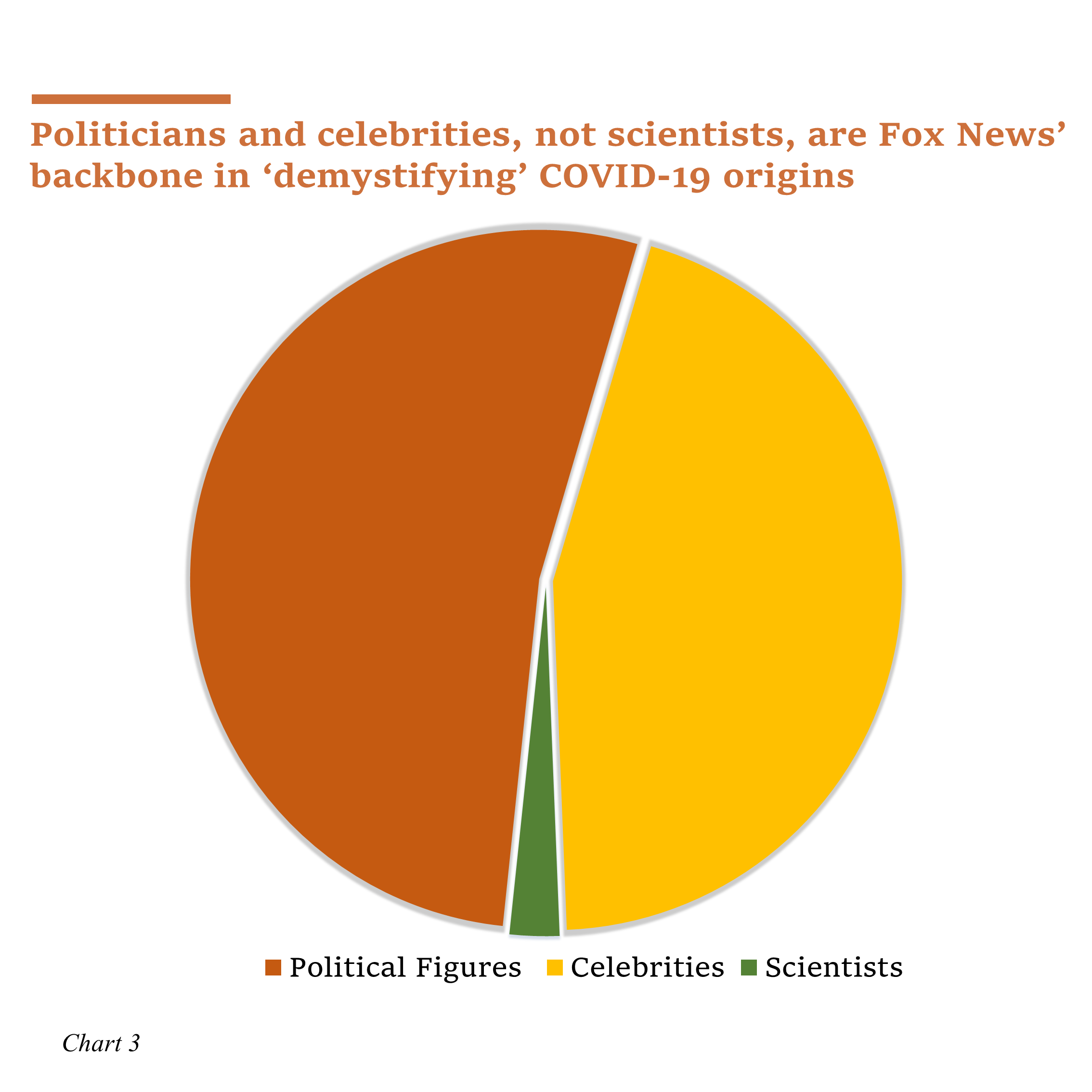 Fox News, in particular, has run amok with disseminating conspiracy theories. As their peers in the WSJ are busy groping for “evidence” in piles of intelligence documents, Fox News’ producers and editors don’t even bother displaying “evidence”, they simply hired a whole bunch of political figures (Mike Pompeo, Tom Cotton, Rand Paul…you name it) and celebrities, which included their own TV personalities, including Tucker Carlson, Sean Hannity, Jesse Watters, and many others. Of the 87 video clips Fox News posted on its official YouTube channel regarding COVID-19’s origins, 52.9% clips involved incumbent or veteran politicians preaching the same old lab leak or bio-weapon conspiracy theories (See Chart 3); when politicians are absent, celebrity hosts come in to fill the void (44.8%); as for the remaining two clips in which at last there is a scientist (sort of) who is speaking in front of the camera, the rhetoric behind the lines has nothing to do with evidence-based science.
