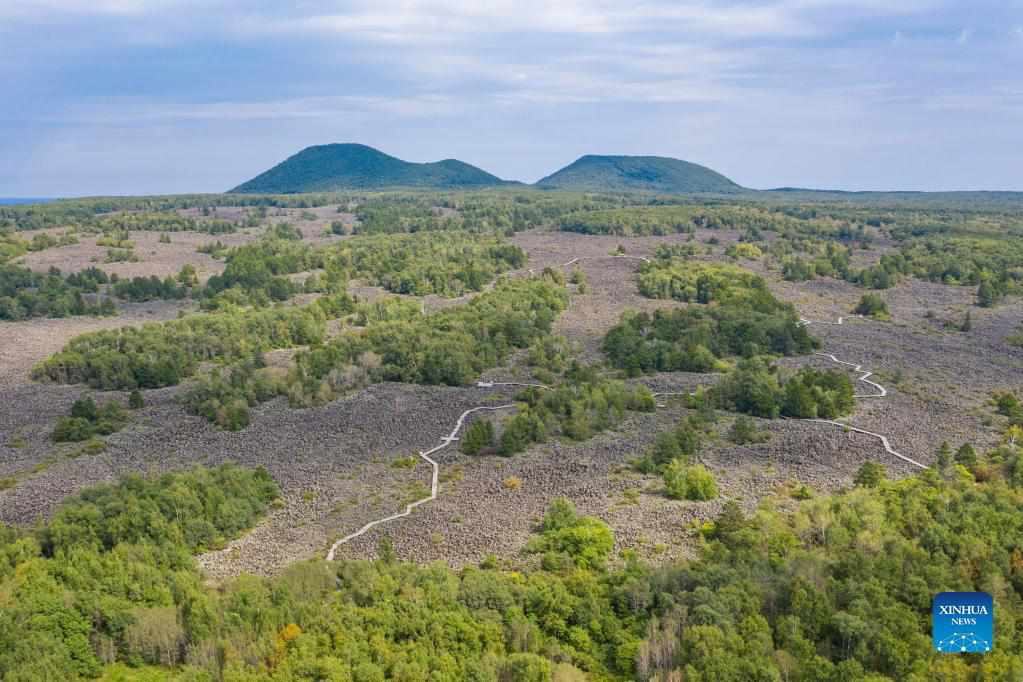 Aerial photo taken on Sept. 2, 2021 shows the scenery of the Wudalianchi Geopark in Heihe, northeast China's Heilongjiang Province. The Wudalianchi Geopark is famed for its volcanoes and hot springs. It has 14 volcanoes and five major volcanic barrier lakes. (Xinhua/Xie Jianfei)