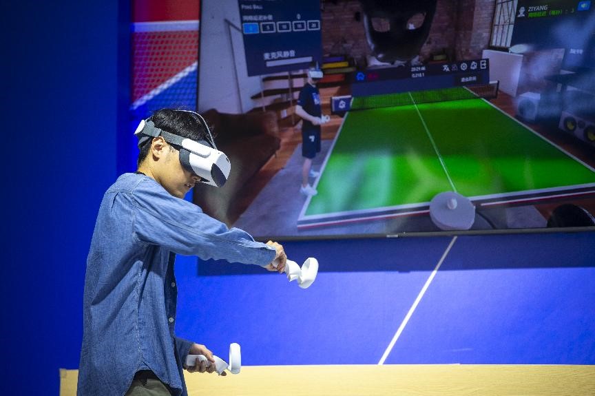 A participant in the 2021 China International Fair for Trade in Services (CIFTIS) tries VR glasses at the China National Convention Center in Beijing, a venue for the event, Sept. 1, 2021. (Yuan Chen/People's Daily Online)