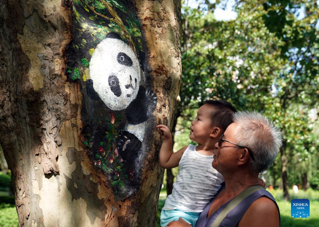 People view a painted tree hole at Zhabei Park in Shanghai, east China, Aug. 31, 2021. Zhabei Park recently made an effort to improve its appearance by cleaning and beautifying tree holes in the park with creative patterns. (Xinhua/Liu Ying)