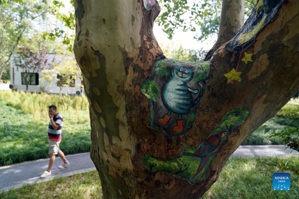 Painted tree holes are seen at Zhabei Park in Shanghai, east China, Aug. 31, 2021. Zhabei Park recently made an effort to improve its appearance by cleaning and beautifying tree holes in the park with creative patterns. (Xinhua/Wang Xiang)