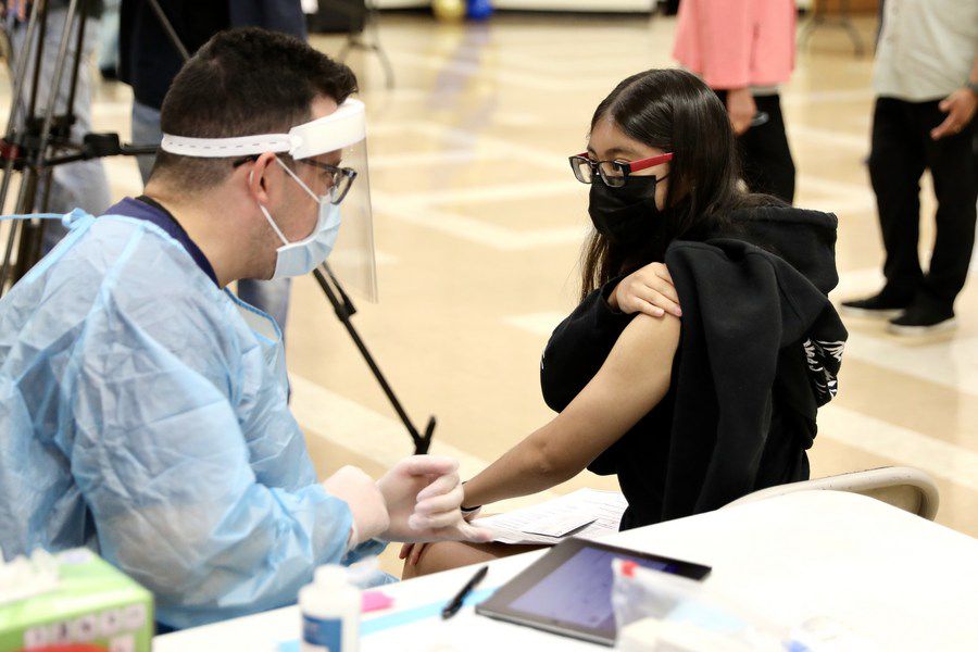 A student prepares to receive the COVID-19 vaccine at the Woodrow Wilson Senior High School in Los Angeles, California, the United States, on Aug. 30, 2021. (Xinhua)