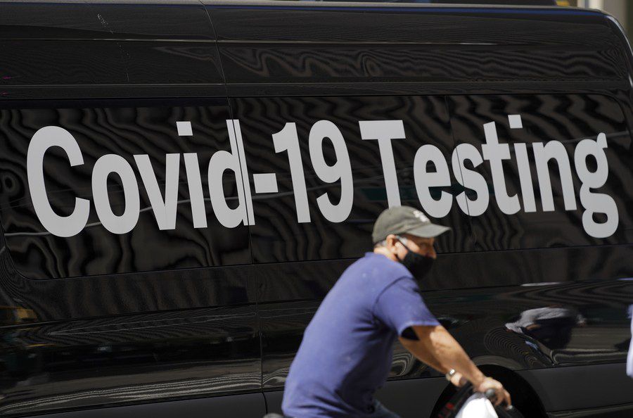 A cyclist rides past a COVID-19 mobile test site in New York City, the United States, Aug. 2, 2021.(Xinhua/Wang Ying)