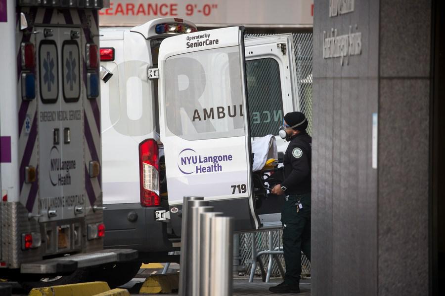 A healthcare worker wheels a patient into an ambulance outside a hospital in New York, the United States, on Jan. 18, 2021. (Photo by Michael Nagle/Xinhua)