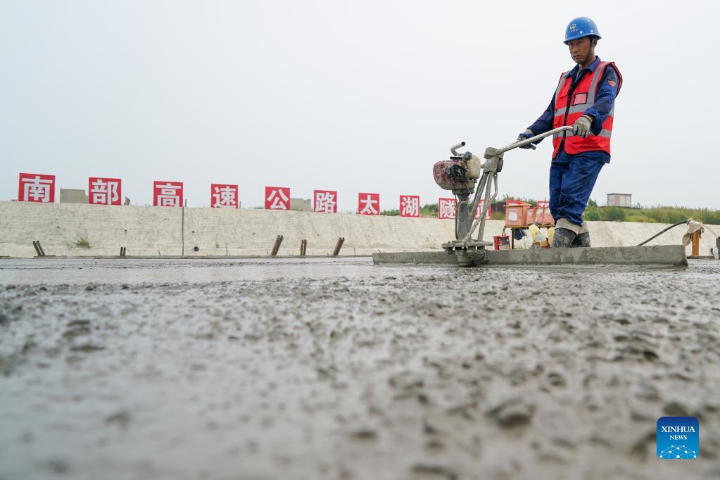 A construction worker is busy at the construction site of Nanquan section of Taihu tunnel, part of the Changzhou-Wuxi Highway, in Wuxi, east China's Jiangsu Province, Sept. 5, 2021. The main construction of the Nanquan section of the Taihu tunnel was completed on Sunday. Taihu tunnel, China's longest underwater highway tunnel, is part of the Changzhou-Wuxi Highway which has a total length of 43.9 km. The 10.8-km-long, 43.6-meter-wide tunnel is under Taihu Lake, China's third-largest freshwater lake. (Xinhua/Li Bo)