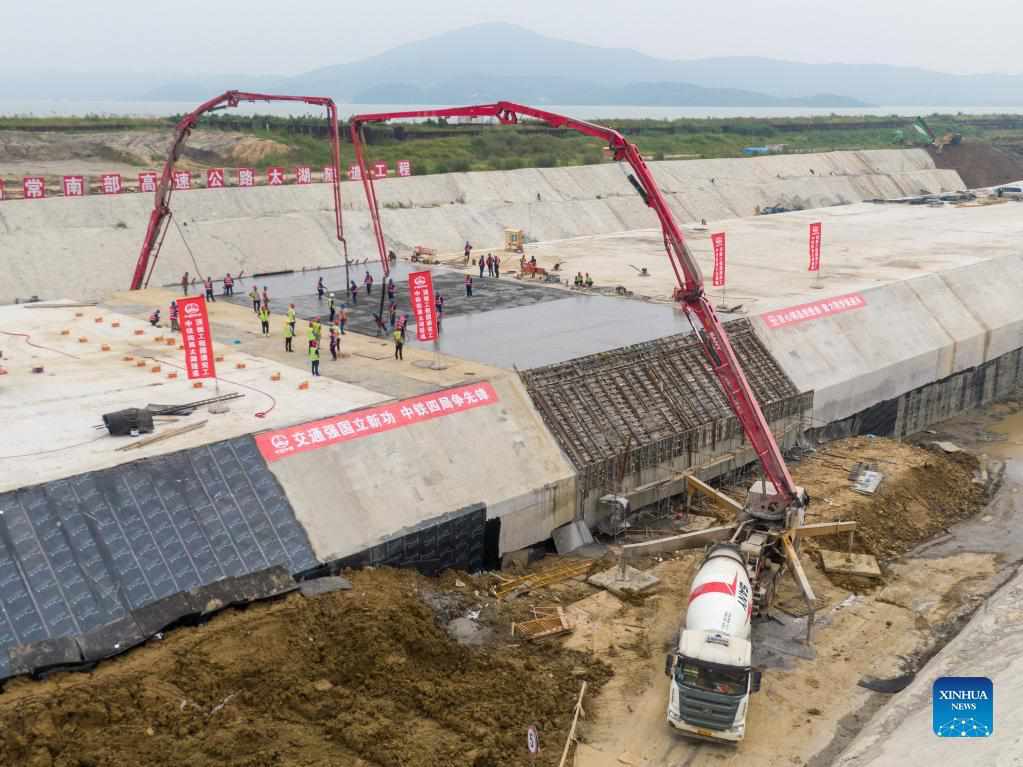 Aerial photo taken on Sept. 5, 2021 shows the construction site of Nanquan section of Taihu tunnel, part of the Changzhou-Wuxi Highway, in Wuxi, east China's Jiangsu Province. The main construction of the Nanquan section of the Taihu tunnel was completed on Sunday. Taihu tunnel, China's longest underwater highway tunnel, is part of the Changzhou-Wuxi Highway which has a total length of 43.9 km. The 10.8-km-long, 43.6-meter-wide tunnel is under Taihu Lake, China's third-largest freshwater lake. (Xinhua/Li Bo)
