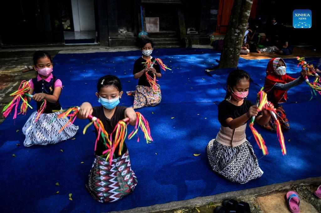 Children wearing face masks practice a traditional dance for the upcoming national virtual dance competition at Rumah Budaya Nusantara (RBN) Puspo Budoyo in Ciputat district, South Tangerang, Indonesia, Sept. 5, 2021. RBN Puspo Budoyo will hold the national virtual dance competition on Sept. 19. (Xinhua/Agung Kuncahya B.)