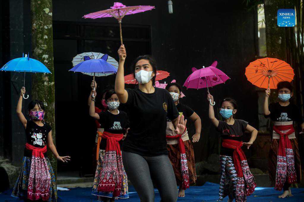 Children wearing face masks practice a traditional dance for the upcoming national virtual dance competition at Rumah Budaya Nusantara (RBN) Puspo Budoyo in Ciputat district, South Tangerang, Indonesia, Sept. 5, 2021. RBN Puspo Budoyo will hold the national virtual dance competition on Sept. 19. (Xinhua/Agung Kuncahya B.)