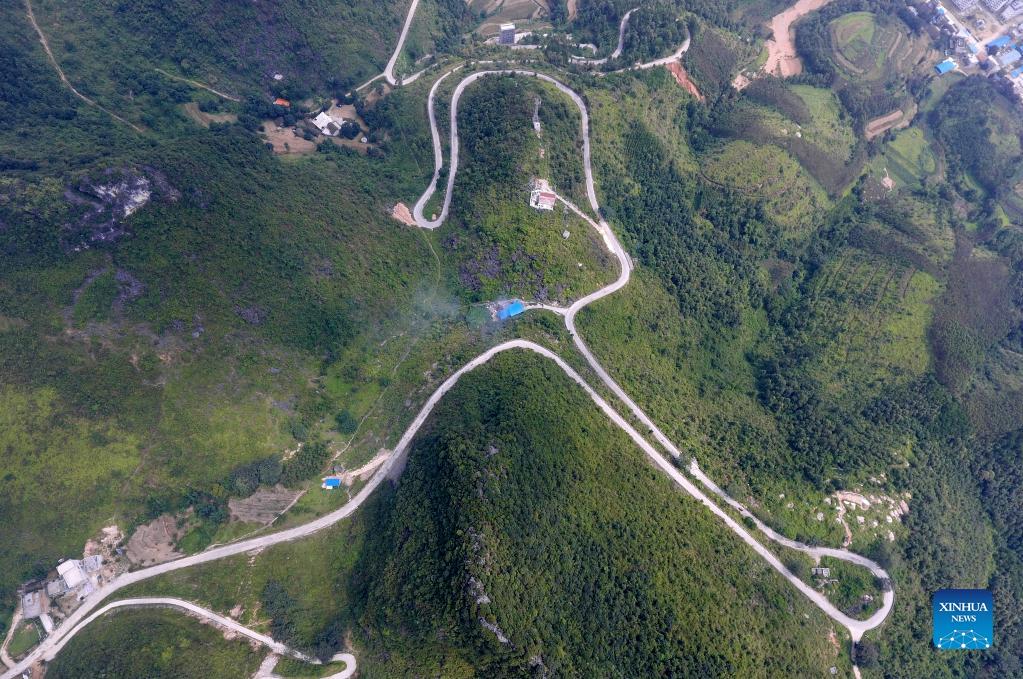 Aerial photo taken on Aug. 2, 2017 shows mountain roads in Lalie Township of Du'an Yao Autonomous County, south China's Guangxi Zhuang Autonomous Region. Du'an is known as the "rocky kingdom" as 89 percent of its administrative region is covered by karst mountains. Poor transportation infrastructure blocked people from the outside and trapped the mountain dwellers in extreme poverty for generations. In recent years, Du'an has invested a lot in upgrading roads in rural areas. The county has seen an expanded road network. As China advances rural vitalization following its eradication of absolute poverty, improved rural roads have helped farmers dispatch their goods and brought tourists and other resources, facilitating the development of industries including e-commerce, tourism and agriculture with local characteristics. (Xinhua/Lu Boan)