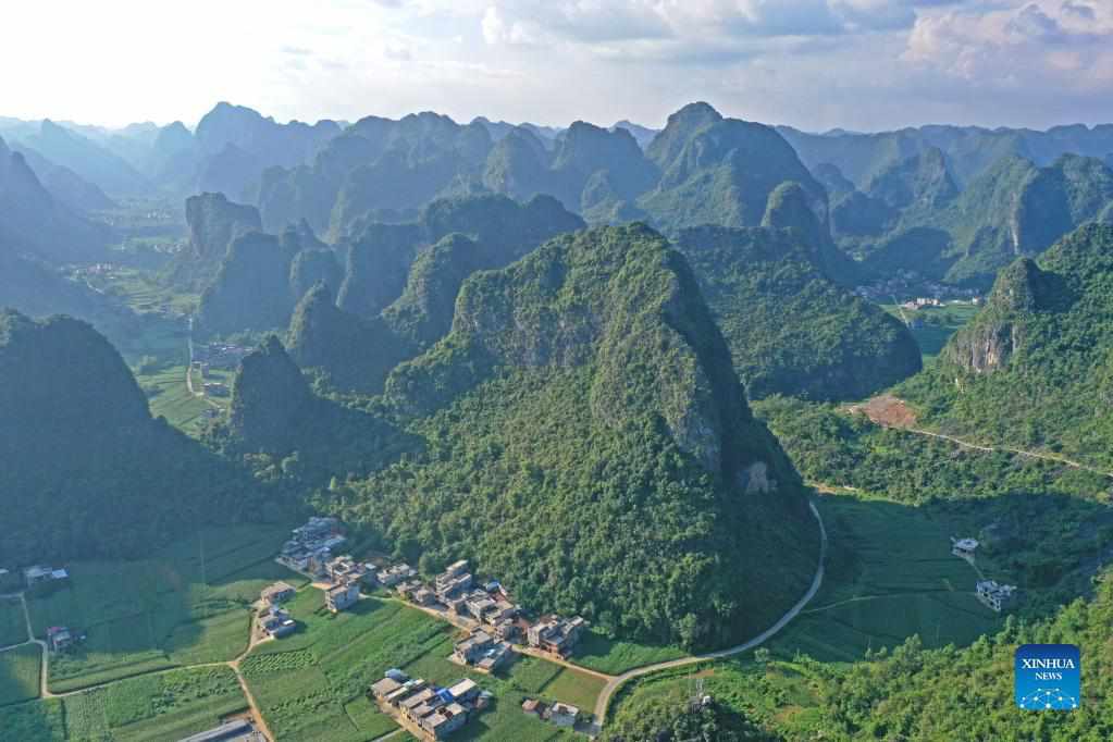 Aerial photo taken on Sept. 2, 2021 shows a rural road in Dongmiao Township of Du'an Yao Autonomous County, south China's Guangxi Zhuang Autonomous Region. Du'an is known as the "rocky kingdom" as 89 percent of its administrative region is covered by karst mountains. Poor transportation infrastructure blocked people from the outside and trapped the mountain dwellers in extreme poverty for generations. In recent years, Du'an has invested a lot in upgrading roads in rural areas. The county has seen an expanded road network. As China advances rural vitalization following its eradication of absolute poverty, improved rural roads have helped farmers dispatch their goods and brought tourists and other resources, facilitating the development of industries including e-commerce, tourism and agriculture with local characteristics. (Xinhua/Zhou Hua)