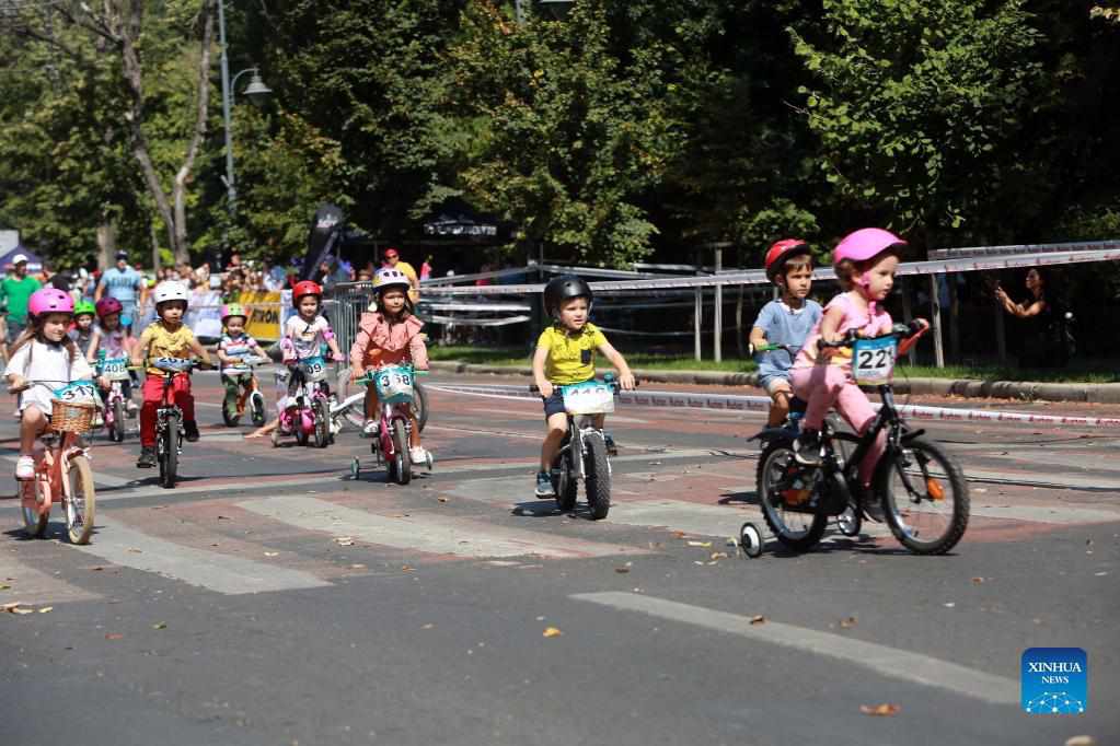 Children participate in a cycling competition in Bucharest, Romania, Sept. 5, 2021. (Photo by Gabriel Petrescu/Xinhua)