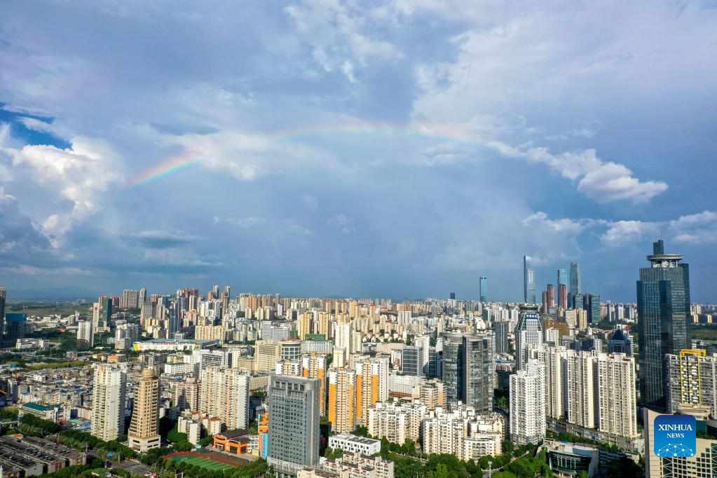 Aerial photo taken on Sept. 5, 2021 shows the view of rainbow in Nanning, south China's Guangxi Zhuang Autonomous Region. (Xinhua/Cao Yiming)