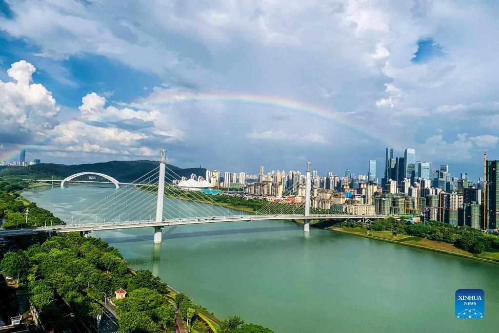 Photo taken on Sept. 5, 2021 shows the view of rainbow in Nanning, south China's Guangxi Zhuang Autonomous Region. (Xinhua/Cao Yiming)