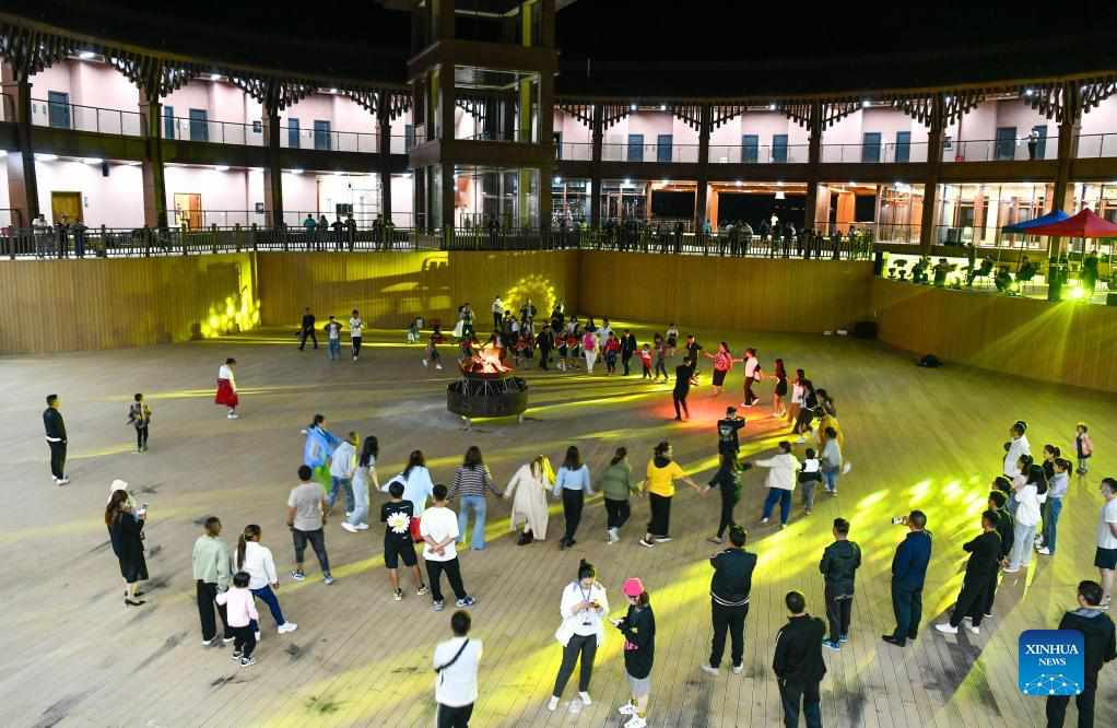 Tourists dance with folk artists at a scenic spot in Hezhang County, southwest China's Guizhou Province, Sept. 3, 2021. Hezhang County, featuring beautiful natural scenery and distinctive culture, has ramped up efforts in improving tourism facilities and boosting tourism industry in recent years. Tourism development of the county has given impetus to its rural revitalization. Statistics show that the county has received 4.34 million visitor trips from January to August this year. (Xinhua/Yang Wenbin)
