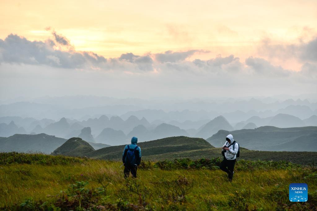 Tourists view the sunrise at a scenic spot in Hezhang County, southwest China's Guizhou Province, Sept. 4, 2021. Hezhang County, featuring beautiful natural scenery and distinctive culture, has ramped up efforts in improving tourism facilities and boosting tourism industry in recent years. Tourism development of the county has given impetus to its rural revitalization. Statistics show that the county has received 4.34 million visitor trips from January to August this year. (Xinhua/Yang Wenbin)