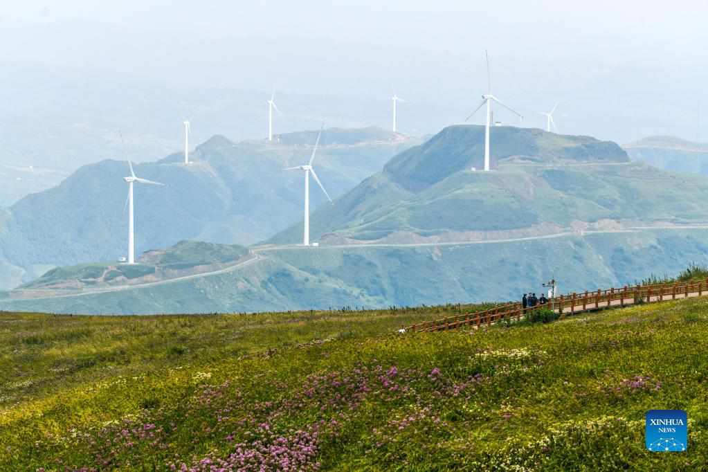 Tourists tour a scenic spot in Hezhang County, southwest China's Guizhou Province, Sept. 3, 2021. Hezhang County, featuring beautiful natural scenery and distinctive culture, has ramped up efforts in improving tourism facilities and boosting tourism industry in recent years. Tourism development of the county has given impetus to its rural revitalization. Statistics show that the county has received 4.34 million visitor trips from January to August this year. (Xinhua/Yang Wenbin)