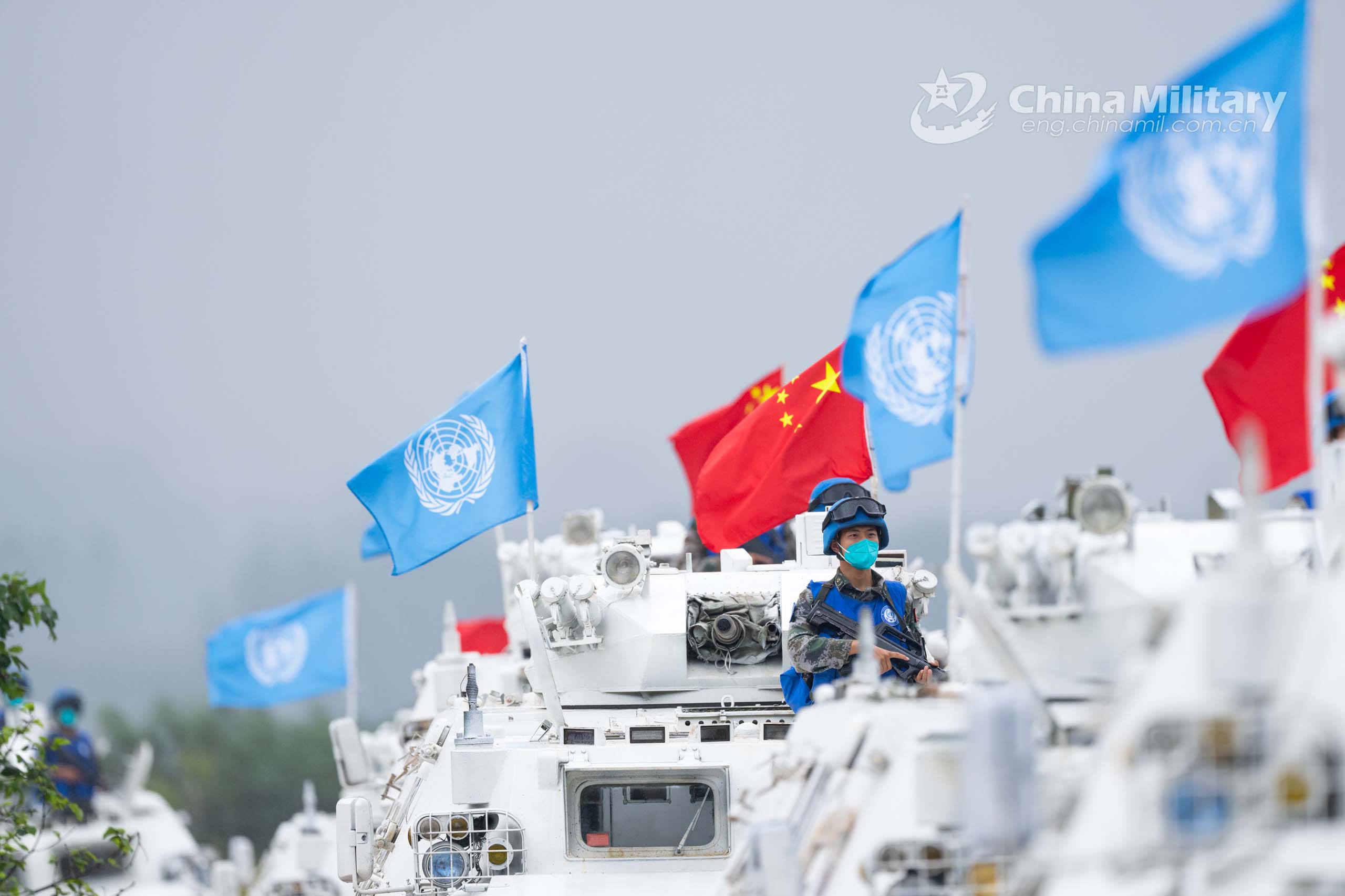 Peacekeepers and their armored vehicles are all settled in Queshan County of Central China's Henan Province on the morning of September 6, 2021. More than 1,000 troops from China, Mongolia, Pakistan and Thailand will participate in the "Shared Destiny-2021" UN peacekeeping field training exercise in China from September 6 to 15, 2021. (eng.chinamil.com.cn/Photo by Wan Quan)