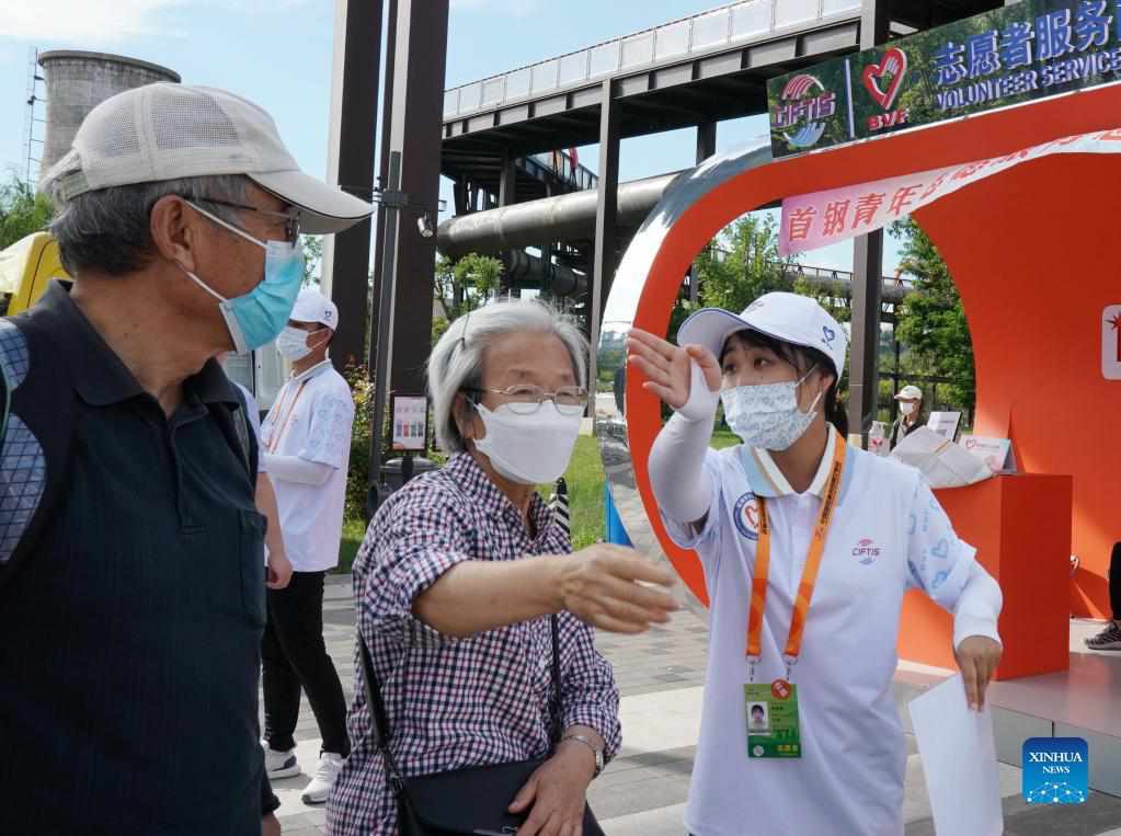 A volunteer shows visitors the way at the Shougang Park during the 2021 China International Fair for Trade in Services (CIFTIS) in Beijing, capital of China, Sept. 6, 2021. (Xinhua/Zhang Chenlin)