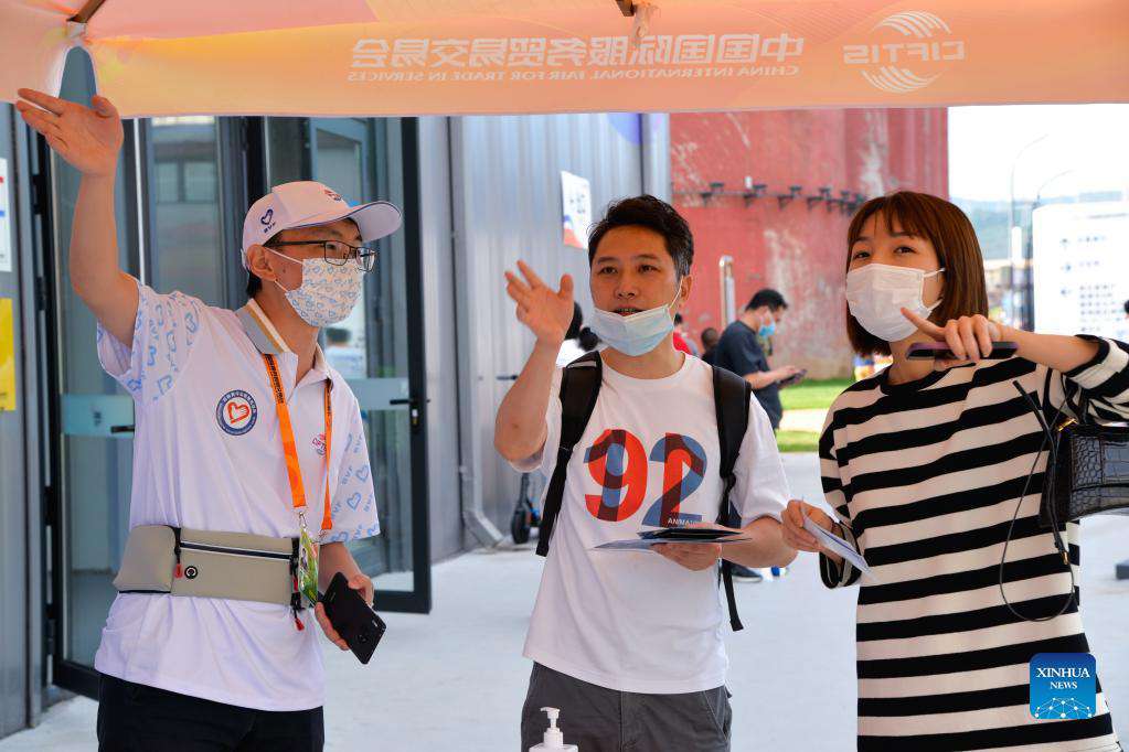 A volunteer (1st L) shows visitors the way at the Shougang Park during the 2021 China International Fair for Trade in Services (CIFTIS) in Beijing, capital of China, Sept. 6, 2021. (Xinhua/Xu Qin)