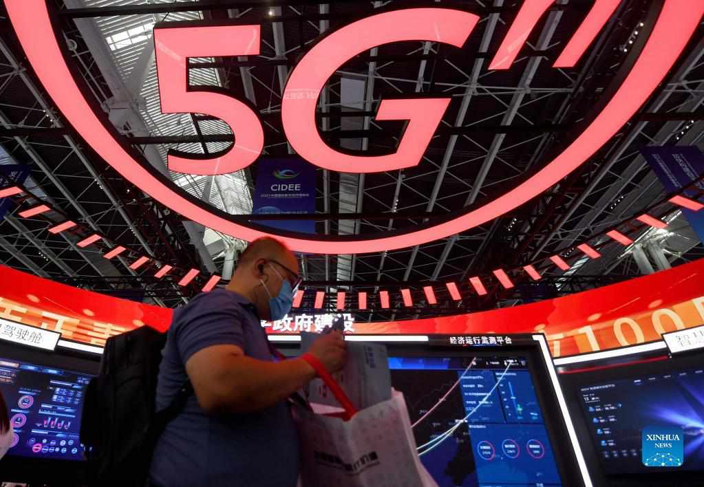 A man walks past the 5G exhibition area at the China International Digital Economy Expo 2021 in Shijiazhuang, north China's Hebei Province, Sept. 6, 2021. Themed "innovative development and digital economy," the China International Digital Economy Expo 2021 was kicked off on Monday and will last until Sept. 8. The expo will focus on new business models, new patterns and hot topics in the digital economy, highlighting the coordinated development of the Beijing-Tianjin-Hebei region, the planning and construction of Xiong'an New Area and the preparation of the 2022 Winter Olympics. (Xinhua/Wang Xiao)