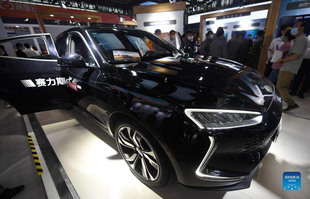 Photo taken on Sept. 6, 2021 shows a smart car at the China International Digital Economy Expo 2021 in Shijiazhuang, north China's Hebei province. Themed "innovative development and digital economy," the China International Digital Economy Expo 2021 was kicked off on Monday and will last until Sept. 8. The expo will focus on new business models, new patterns and hot topics in the digital economy, highlighting the coordinated development of the Beijing-Tianjin-Hebei region, the planning and construction of Xiong'an New Area and the preparation of the 2022 Winter Olympics. (Xinhua/Wang Xiao)