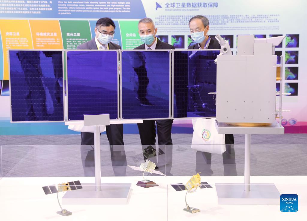 People visit a satellite model on an exhibition featuring big data and sustainable development goals in Beijing, capital of China, Sept. 6, 2021. The exhibition accompany with the founding conference of the International Research Center of Big Data for Sustainable Development Goals (SDGs) and the opening ceremony of the International Forum on Big Data for Sustainable Development Goals kicked off in Beijing on Monday. (Xinhua/Jin Liwang)