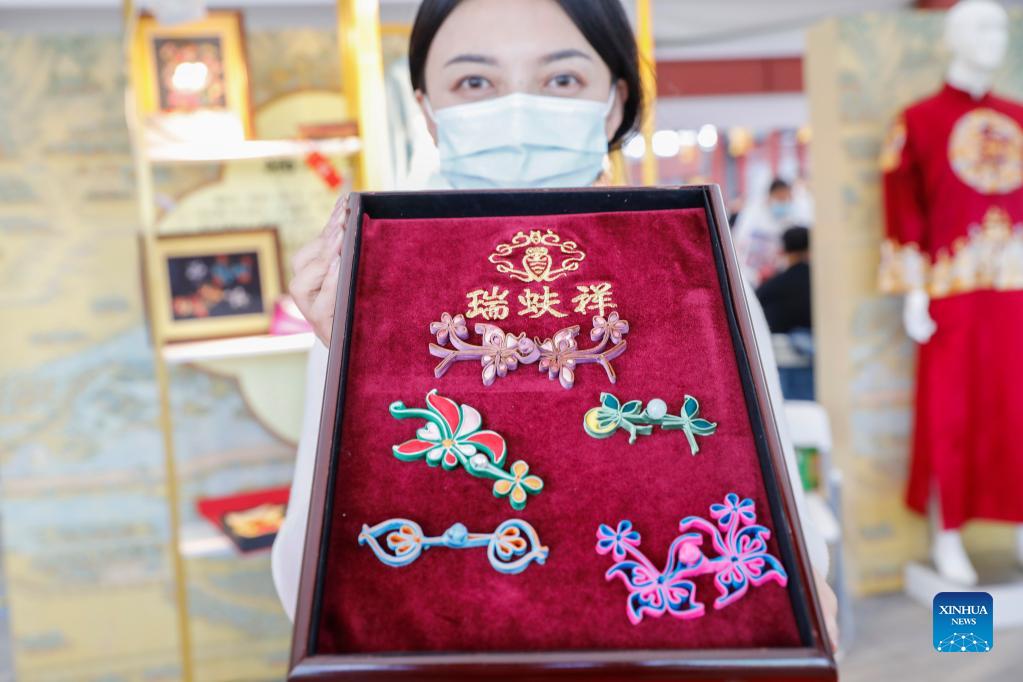 An exhibitor from Ruifuxiang, a time-honored brand of silk, shows handmade frogs in Shougang Park during the China International Fair for Trade in Services (CIFTIS) in Beijng, capital of China, Sept. 6, 2021. (Xinhua/Zhang Yuwei)