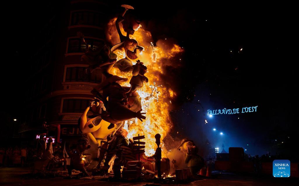 Giant dolls are burnt during the Fallas Festival celebrations in Valencia, Spain, on Sept. 5, 2021. The Fallas Festival is a traditional celebration in commemoration of Saint Joseph in the city of Valencia. The festival was postponed until this September due to the COVID-19 pandemic. (Photo by Pablo Morano/Xinhua)