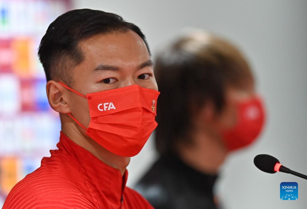Wu Xi of China attends a press conference ahead of the Group B match against Japan of FIFA World Cup Qatar 2022 Qulifier in Doha, Qatar, Sept. 6, 2021. (Photo by Nikku/Xinhua)