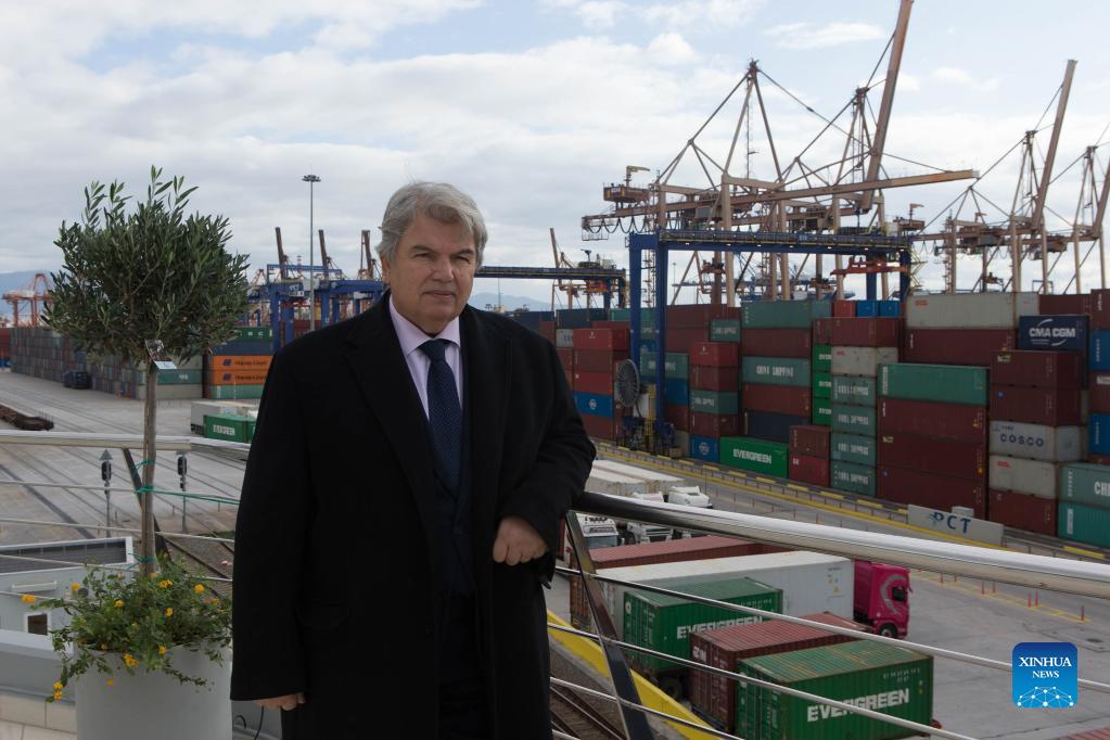 Photo taken on Dec. 5, 2019 shows Tassos Vamvakidis, commercial manager of Piraeus Container Terminal S.A., the Piraeus subsidiary of China Ocean Shipping Company (COSCO), posing for a photo on the balcony of his office building in Piraeus, Greece. (Photo by Marios Lolos/Xinhua)