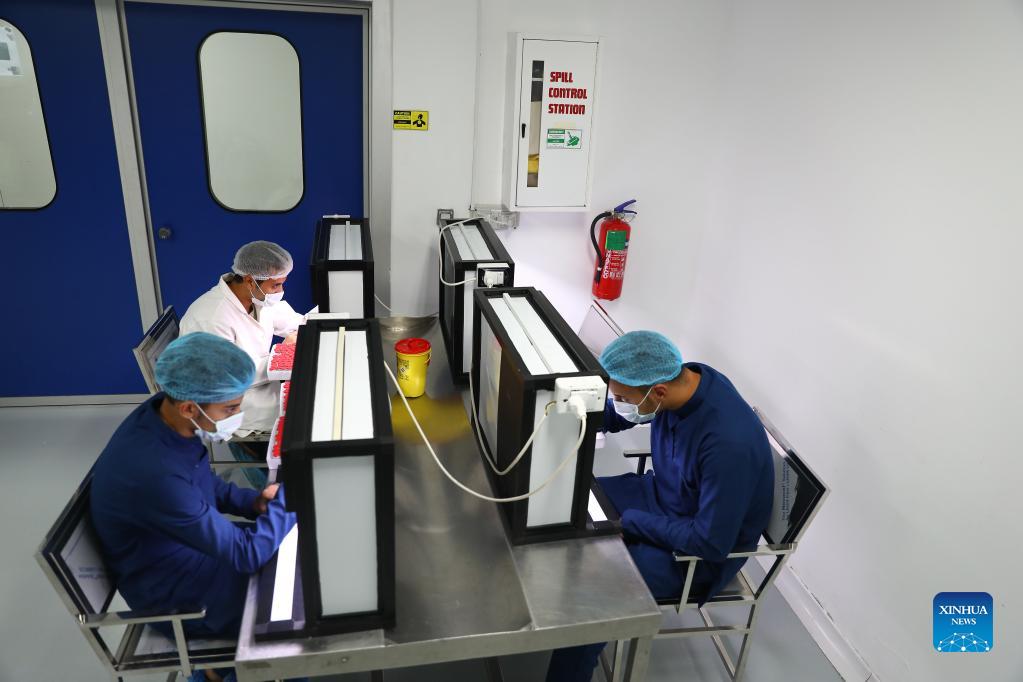 Staff members check COVID-19 vaccines produced at a VACSERA factory in Giza, Egypt, Sept. 6, 2021. The factories of Egypt's state-owned vaccine production company have been working nonstop over the past few months to locally manufacture millions of doses of Chinese COVID-19 vaccine Sinovac, as the most populous Arab country eyes becoming a regional hub for vaccine production and exportation. (Xinhua/Ahmed Gomaa)
