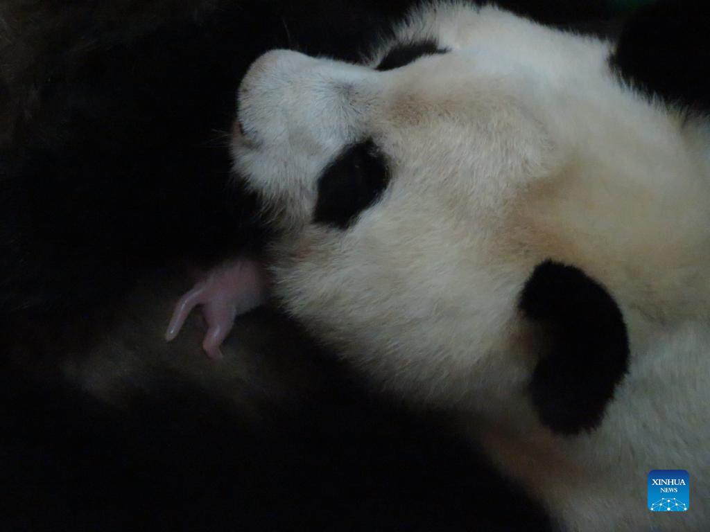 Photo taken on Sept. 6, 2021 shows the giant panda Hua Zuiba and her newborn panda cub in Zoo Aquarium in Madrid, Spain. Two giant panda cubs born in the Madrid Zoo Aquarium on Monday were doing fine and in good health, according to the zoo authorities on Tuesday. It is still too early to confirm the sexes of the baby pandas, said the zoo, expecting for help from two specialists from China's Chengdu Research Base of Giant Panda Breeding. (Zoo Aquarium de Madrid/Handout via Xinhua)