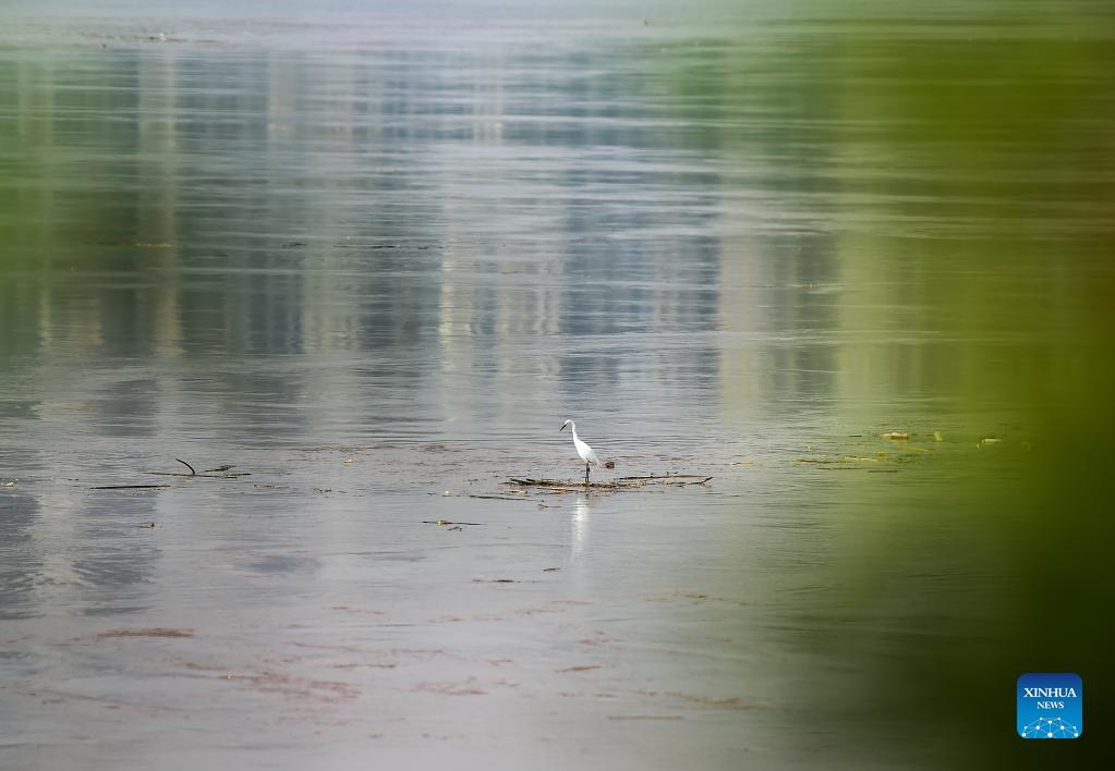 Photo taken on Sept. 7, 2021 shows a bird resting on a floating object in the flood-affected area in southwest China's Chongqing Municipality. The emergency response for flood control was upgraded from level III to II on Tuesday, according to Chongqing's flood control and drought relief headquarters. (Xinhua/Wang Quanchao)