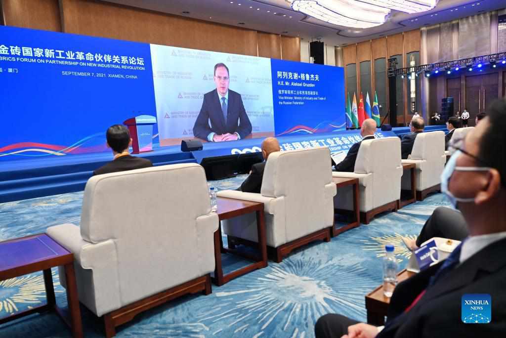 Aleksei Gruzdev, Vice Minister of Ministry of Industry and Trade of the Russian Federation, is seen on screen as he addresses the BRICS Forum on Partnership on New Industrial Revolution via video link in Xiamen, southeast China's Fujian Province, Sept. 7, 2021. The BRICS Forum on Partnership on New Industrial Revolution was held here on Tuesday. (Xinhua/Lin Shanchuan)